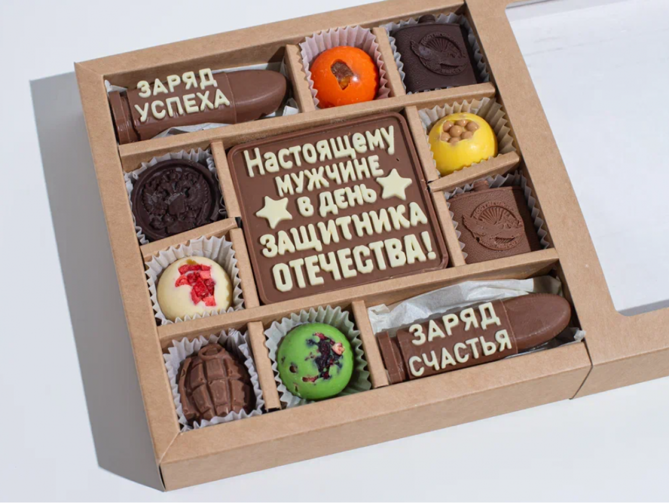 Шоколадный подарочный набор "23 февраля" заряд успеха для мужчины. В набор входят шоколадные изделия к "23 февраля" и конфеты из шоколада ассорти, ручной работы.