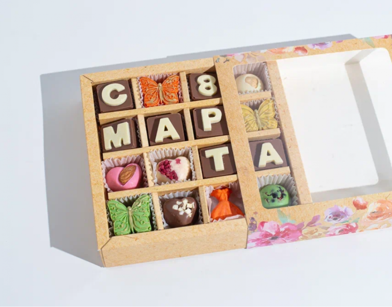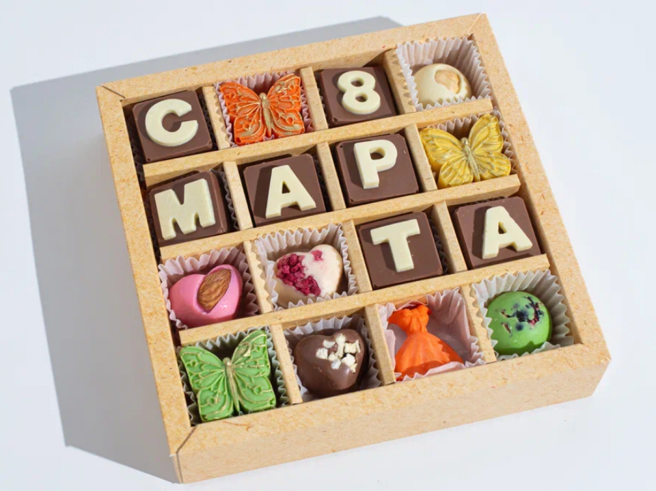 Шоколадный подарочный набор c "8 марта" с буквами, от производителя @choco.cake.hand можно заказать в брендированной упаковке или с логотипом изготовителя. Набор шоколадных конфет ручной работы будет отличным сладким подарком на любой праздник и подарит минутки сладкого удовольствия.